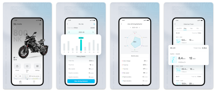 Velmi rostoucí značka a silně se rozvíjející čínský hráč na Českém trhu do vod vstoupil svojí aplikací, která zpracovává veškerá data z tvojí CF moto motorky a ty si můžeš procházet detaily trasy, detaily chování a stavu motocyklu zpětně. Zároveň zajišťuje komunikaci se speciálním boxem, který je k vybraným typům CF moto nutný přikoupit. U vyšších a novějších typů jako je např. MT800 je Bluetooth komunikace integrována do LCD displeje.