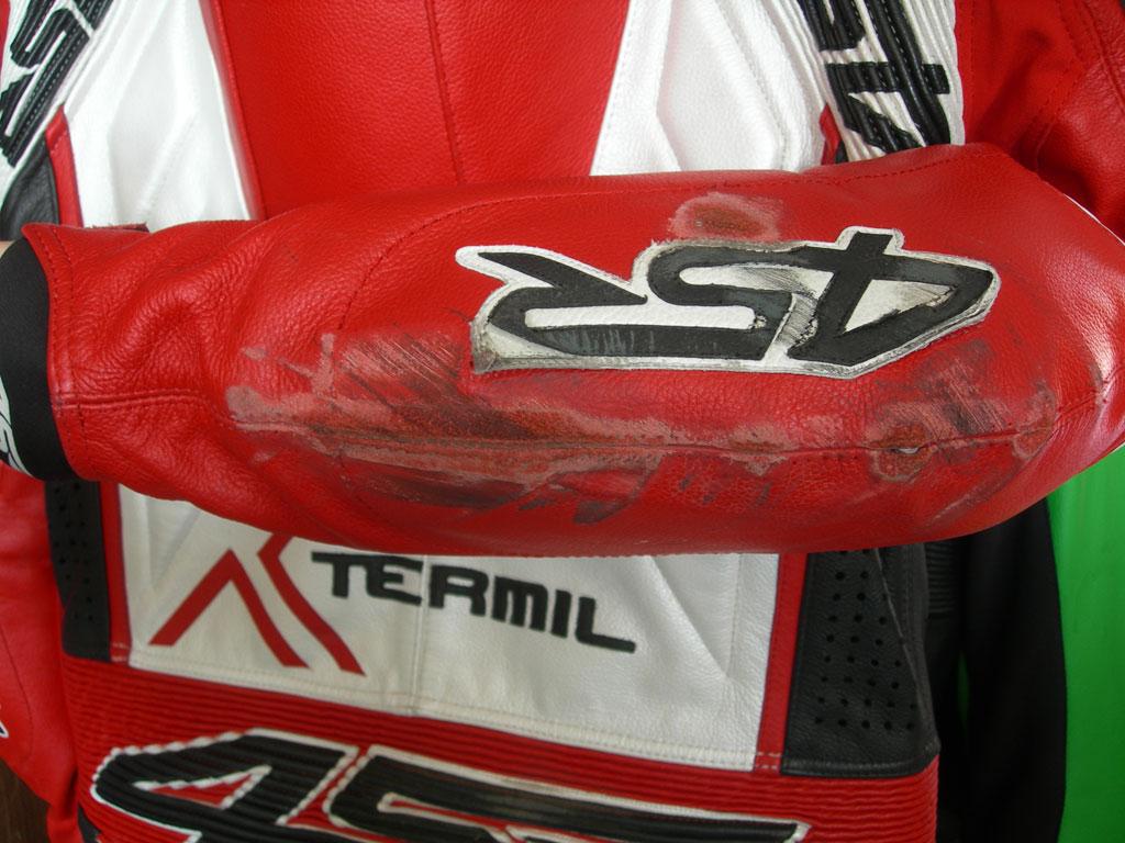 Lukáš Pešek odolnost své 4SR motocyklové kombinézy poprvé vyzkoušel ve španělském Jerezu. Byl to třetí start českého jezdce mezi elitou jezdců silničních závodů motocyklů. Bohužel zde nebylo Lukášovi souzeno spatřit šachovnicový prapor. Po uklouznutí přední pneumatiky vyletěl mimo trať.